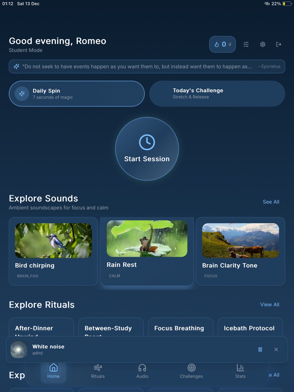 This app helps you build intentional daily stretching rituals that improve posture, mobility, and body awareness over time. Track your progress, complete challenges, and stay present with sound-guided sessions designed to put you into flow.
